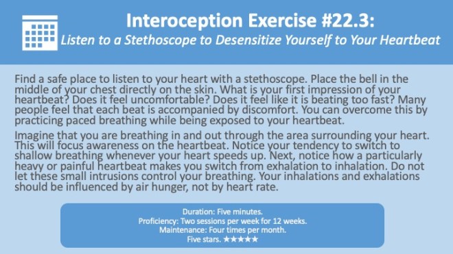 Spend $10 and buy yourself a stethoscope online. Use it as a direct line to your heart. As you listen to your stethoscope, you will come to realize that your heart is like a fearful little animal inside your chest. Cravings for dopamine cause us to excite it, abuse it, poke at it, and sensitize it further to fearful stimuli. However, merely listening to it beat will desensitize you to the negative sensations emanating from it.